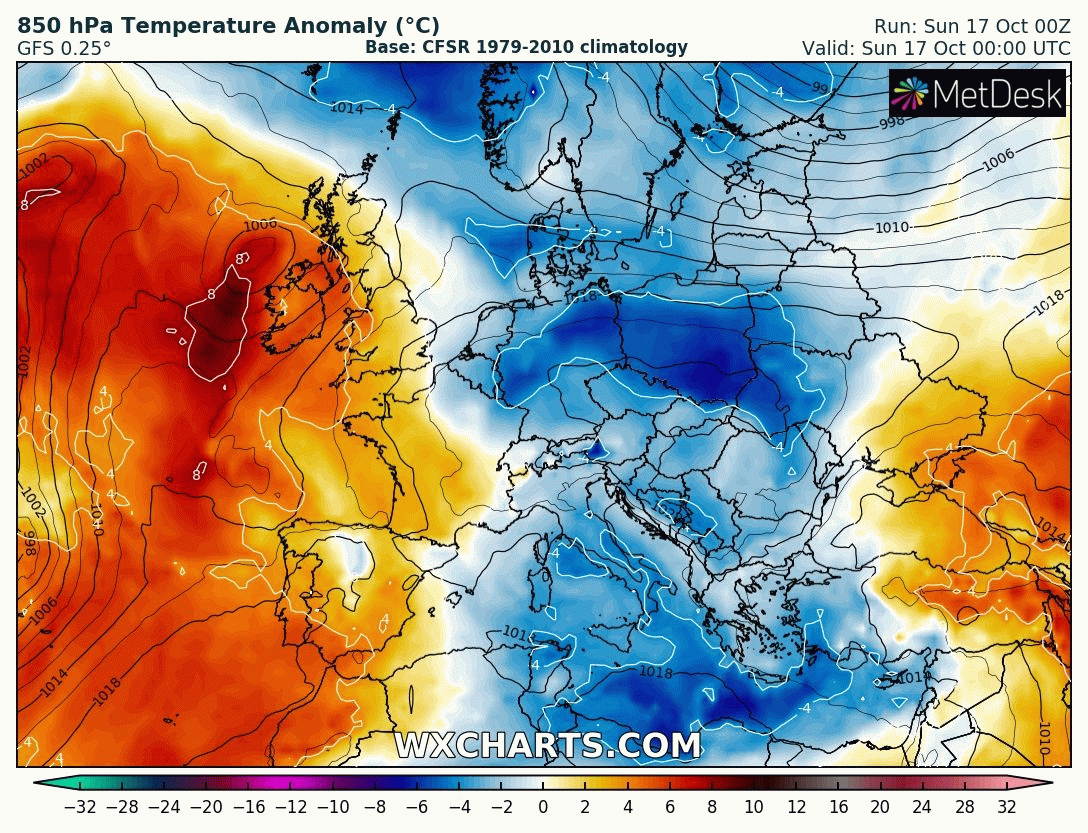 Anomalie de température de la masse d'air (à 1500m d'altitude) - du 17 au 20 octobre 2021 - Modèle GFS via WxCharts