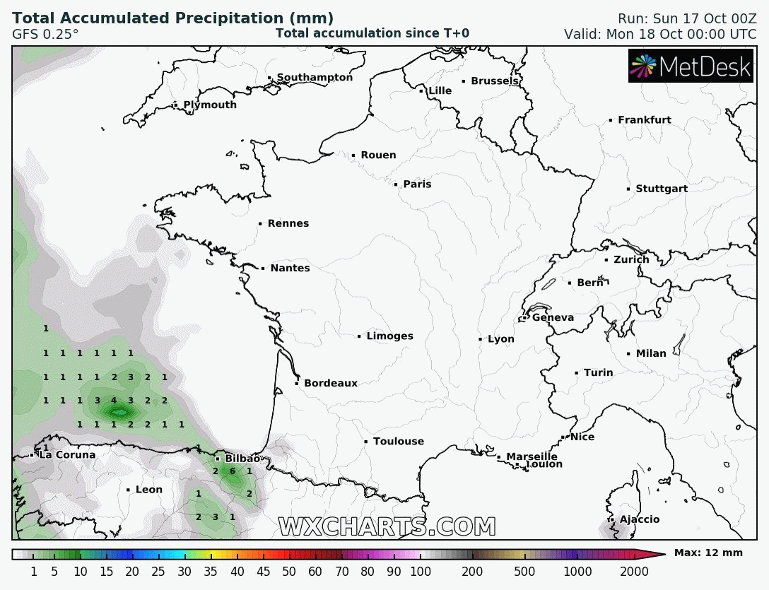 Accumulation des précipitations modélisées jusqu'au lundi 25 octobre 2021 inclus - Modèle GFS via WxCharts