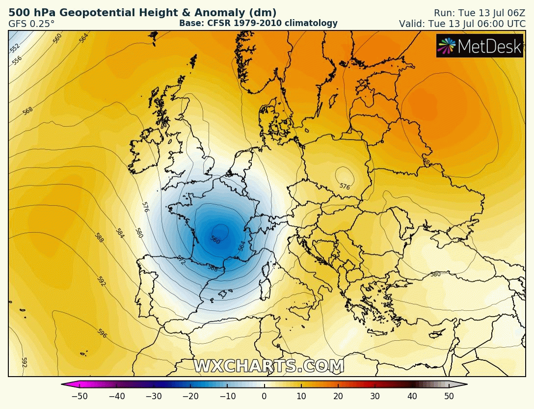 Anomalie de géopotentiel à 500 hPa du mardi 13 au vendredi 16 juillet 2021 - via wxcharts.com