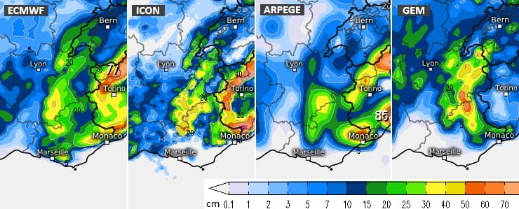 Il n'est pas sûr que la totalité des précipitations tombent sous forme de pluie sur la côte d'Azur. Certains scénarios comme celui du modèle européen (CEP) évoquent un risque de neige par effet d'isothermie à proximité des côtes, jusqu'à Marseille. Le modèle allemand (ICON) va même plus loin et étend les précipitations neigeuses vers le Languedoc (bien que ce scénario soit minoritaire).