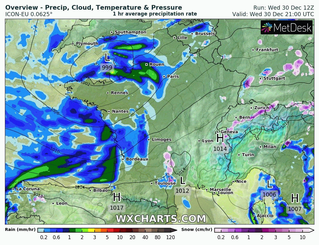 Animation des précipitations du 1er janvier 2021 au soir au 3 janvier 2021 au matin - modèle ICON via wxcharts.com