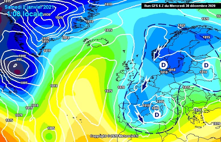 Situation à échelle continentale pour le samedi 2 janvier 2021 - modèle GFS via meteociel.fr