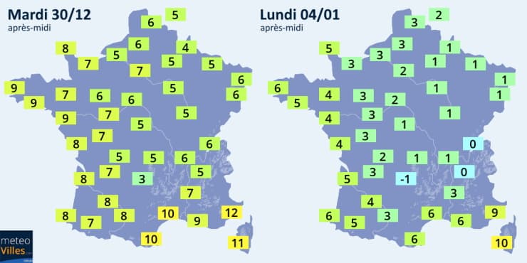 Températures maximales relevées ce mardi 30 décembre 2020 et prévues le lundi 4 janvier 2021 - Météo Villes