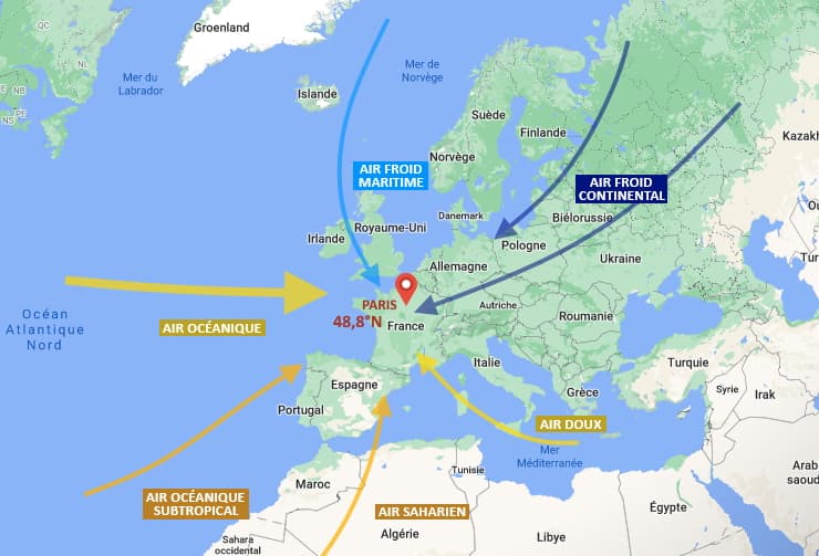 Schéma des flux en France durant la saison hivernale - Météo Villes (fond Google Maps)