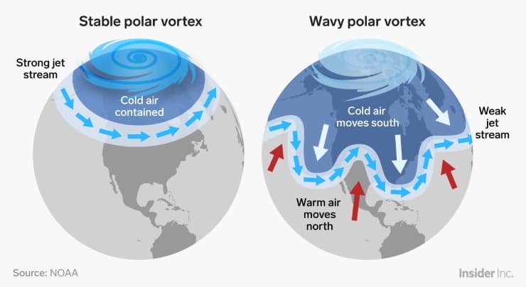 De plus, l'océan Arctique (situé au nord de l'Amérique) est totalement glacé durant l'hiver et c'est un air particulièrement froid qui y stagne. Dès qu'une ondulation du jet stream intervient et que le flux bascule au secteur nord-ouest ou nord, l'air polaire peut alors directement plonger sur les États-Unis et le Canada. Comme cet air ne rencontre aucune mer ou océan (la baie d'Hudson est également gelée), il ne se réchauffe que très peu en progressant vers le sud et les températures peuvent descendre très bas !