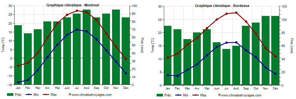 Comparaison de l'évolution des températures moyennes et des précipitations à Montréal et Bordeaux durant l'année – Climats et Voyages