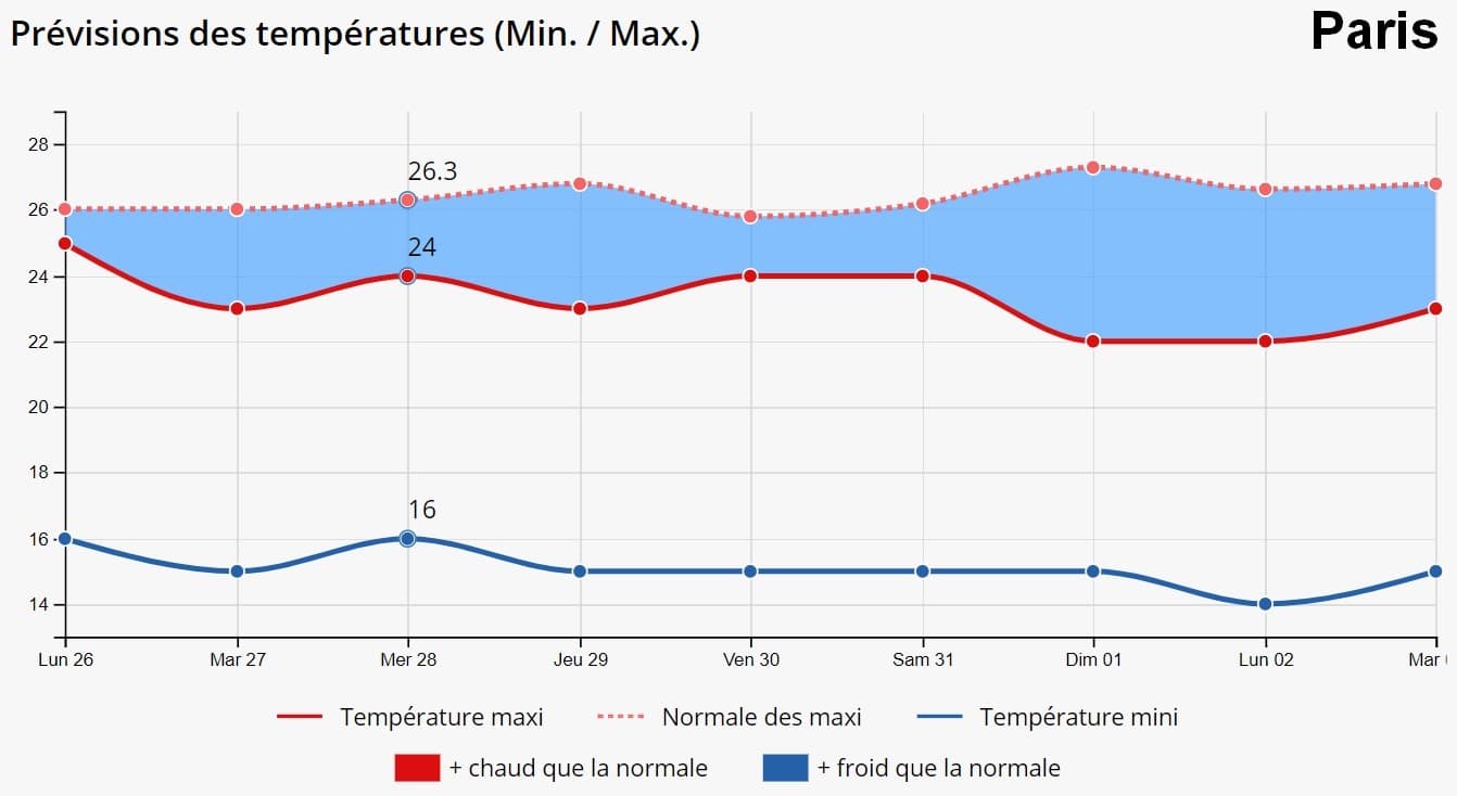 On attend par exemple pas plus de 24°C cette semaine à Paris alors que la normale se situe autour de 26/27°C, même chose pour Lille avec pas plus de 22°C au plus chaud pour une moyenne située en cette saison autour de 25°C.