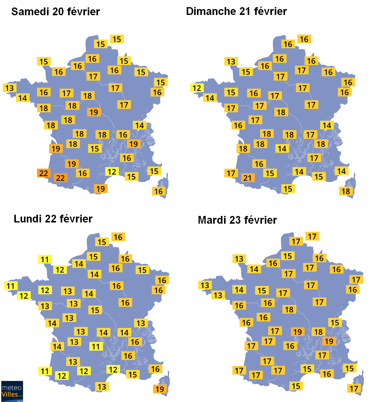 Températures maximales prévues entre samedi 20 et mardi 23 février – Météo-Villes