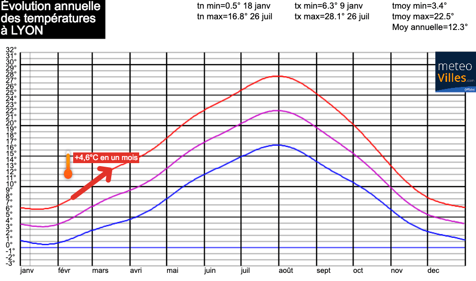 La transition entre hiver avec les premiers épisodes de douceur est également visible sur le reste du pays, comme par exemple sur l’agglomération Lyonnaise. Là encore les températures moyennes quotidiennes subissent une hausse remarquée durant le mois de février et les températures moyenne mensuelles maximales gagnent jusqu'à 4.6°C entre février et mars (passant de 8.4 à 13°C).
