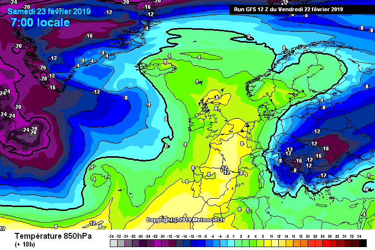Températures à 850 hPa sur l'Ouest de l'Europe le 23 février 2019 - Modèle GFS via météociel.fr