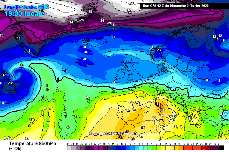 Températures à 850 hPa sur l'Ouest de l'Europe le 3 février 2020 - Modèle GFS via météociel.fr