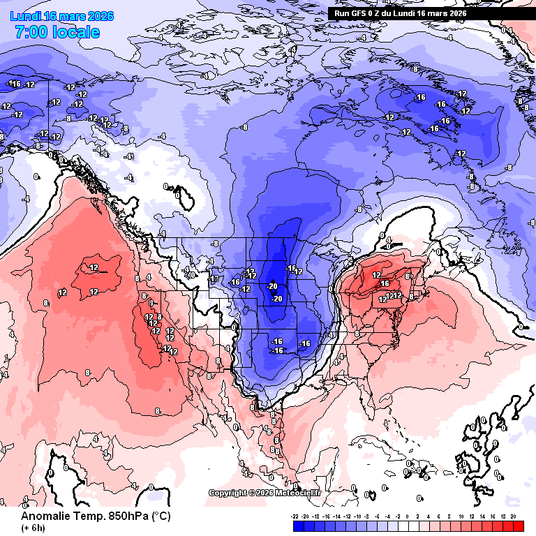 Animation des anomalies de températures à 850 hPa sur le nord de l'Amérique du 16 au 22 mars 2026 – Modèle GFS via meteociel.fr