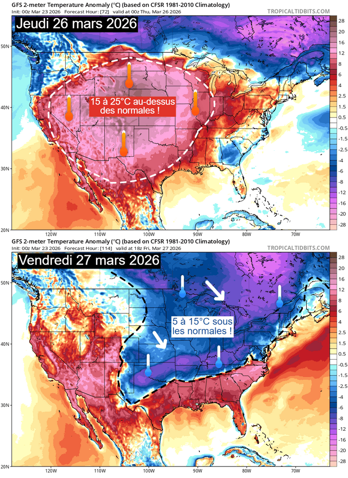 Comparaison des anomalies de températures à 2m entre le 26 et le 27 mars 2026 aux États-Unis – Via TropicalTidBits