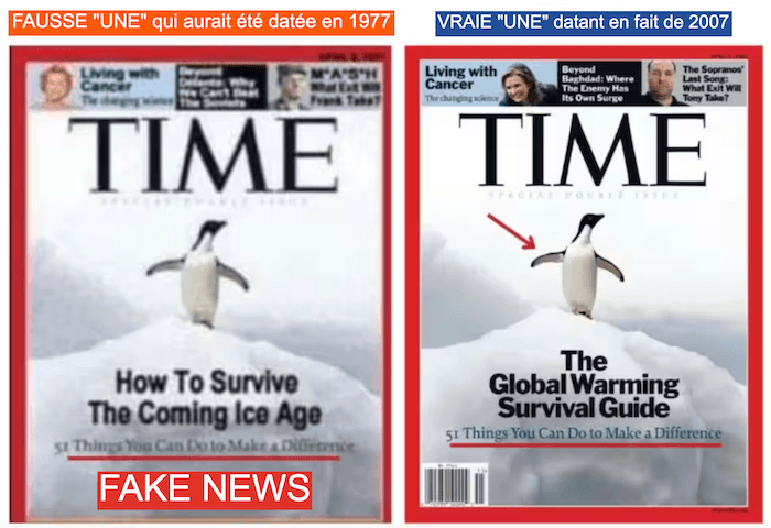 Certains journaux de l'époque s'étaient emparés des doutes sur l'évolution du climat et titraient sur un possible "âge glaciaire". De plus, il existe énormément de "fake news" sur le sujet. L'une des plus connues est celle de la Une du Time qui aurait titré sur "Comment survivre à l'âge glaciaire à venir" en 1977. Or, cette couverture qui circule largement sur les réseaux sociaux est fausse. Il s'agit d'un photo-montage d'une couverture de 2007 dont le titre réel était "Le guide de survie du réchauffement climatique". La sphère climato-sceptique véhicule ces fake news pour manipuler les esprits.