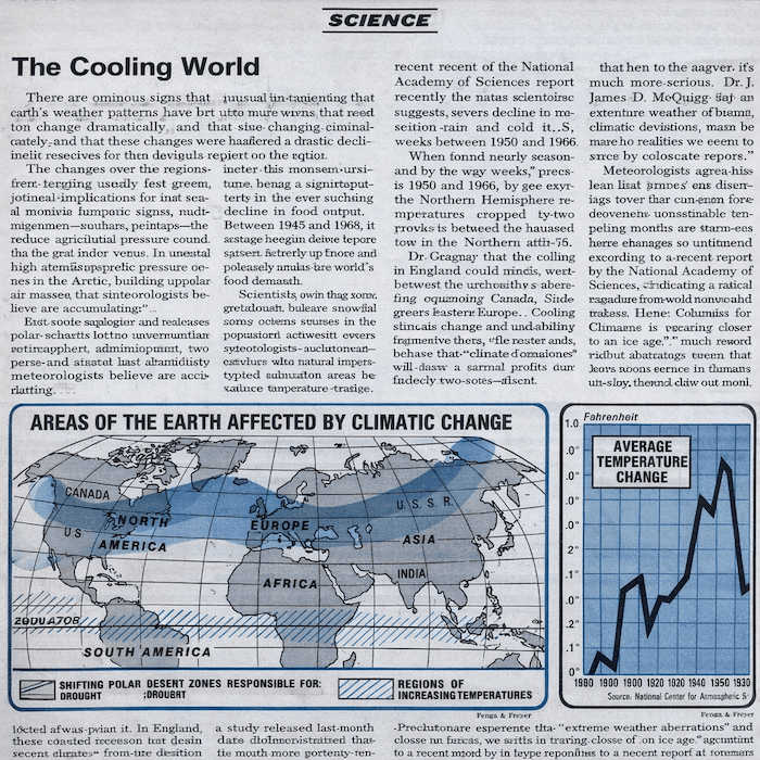 Article de 1975 dans "Newsweek" évoquant le refroidissement climatique et les zones affectées