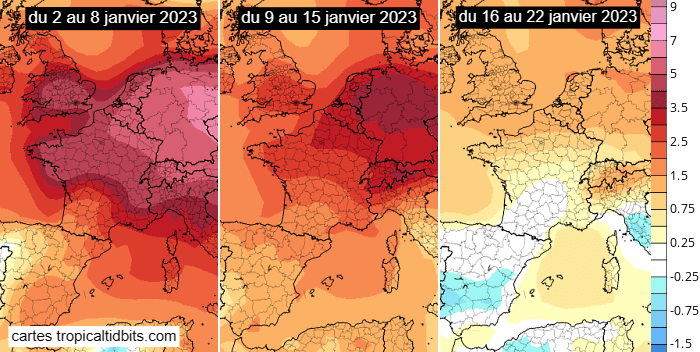 Ces projections sont corroborées par les tendances hebdomadaires du modèle européen. Cette semaine du 2 au 8 janvier 2023 devrait afficher une anomalie thermique proche de +4 à +5°C en France. Celle-ci s'atténuerait quelque peu en semaine du 9 au 15 janvier, s'établissant plutôt autour de +2 à +3°C. Elle s'estomperait encore en semaine du 16 au 22 janvier, se situant plutôt vers +1°C. Quoiqu'il en soit, il n'est pas modélisé d'anomalie froide avant au moins une bonne quinzaine de jours.