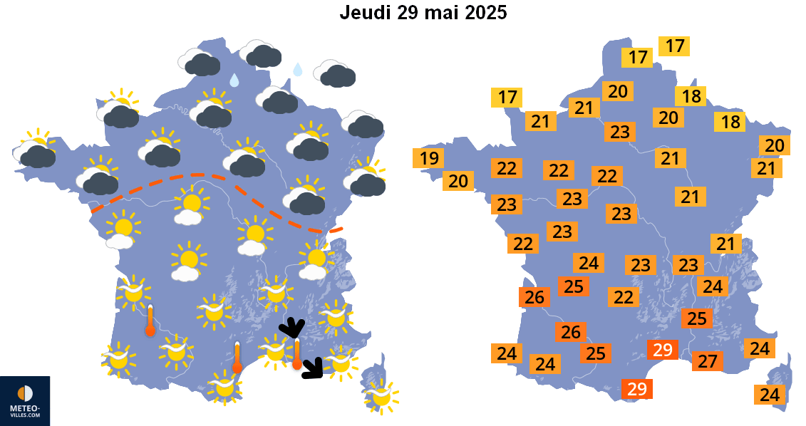 Météo et températures maximales pour le jeudi 29 mai 2025 – Météo-Villes