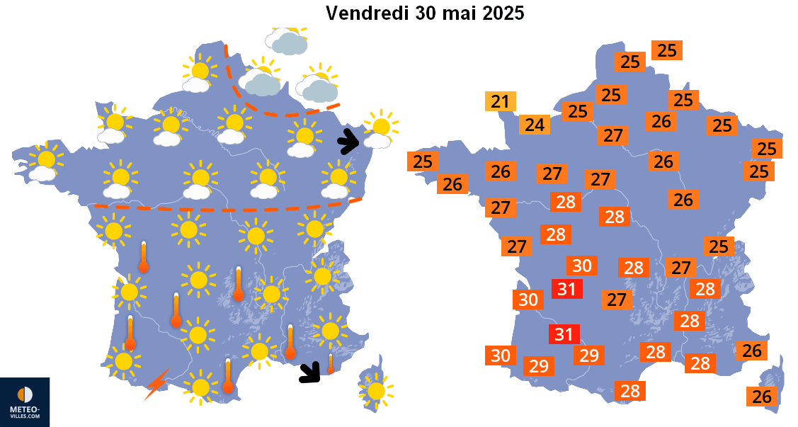 Météo et températures maximales pour le vendredi 30 mai 2025 – Météo-Villes