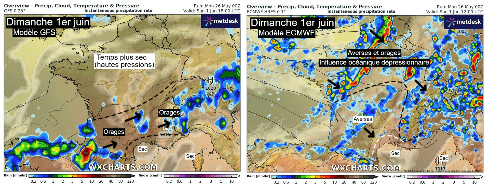 Comparaison des scénarios des modèles américains et européens pour la journée du dimanche 1er juin 2025 – Via WX CHARTS