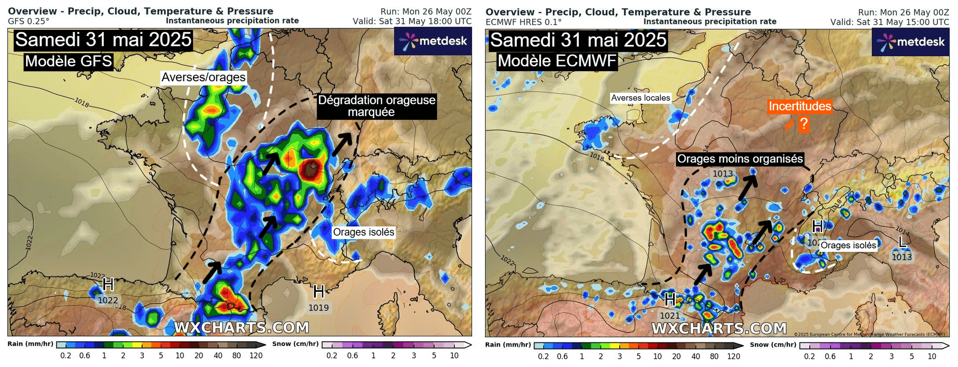 Comparaison des scénarios des modèles américains et européens pour la journée du samedi 31 mai 2025 – Via WX CHARTS