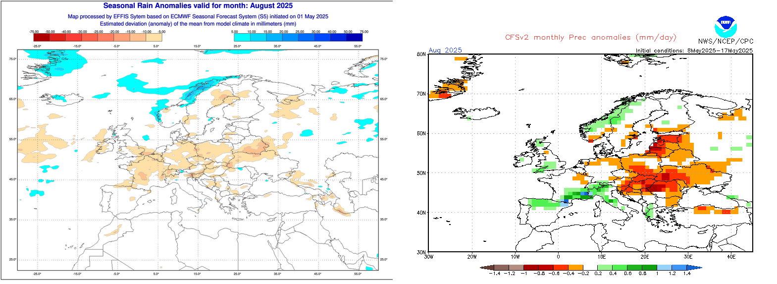 Anomalies de précipitations sur l'Europe pour le mois de juillet 2025 – ECMWF et CFS