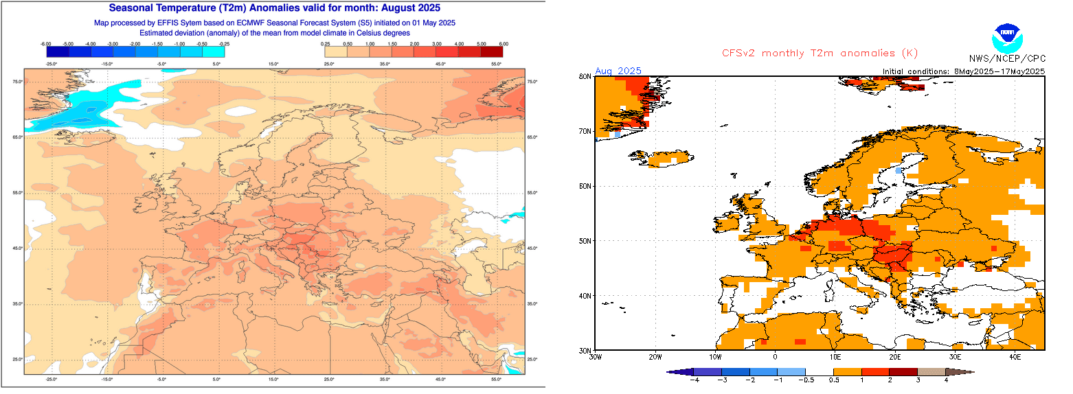 Anomalies de températures sur l'Europe pour le mois de juillet 2025 – ECMWF et CFS