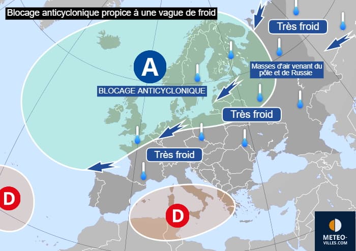 Schéma d'un blocage anticyclonique propice à une vague de froid en France - Météo Villes