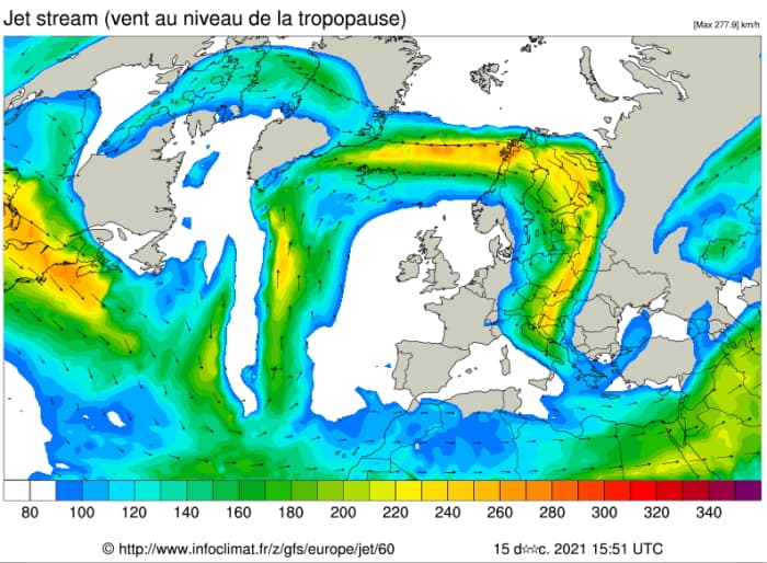 Modélisation du jet stream pour le samedi 18 décembre 2021 - via infoclimat.fr
