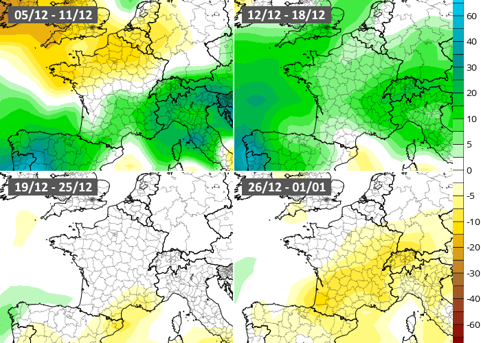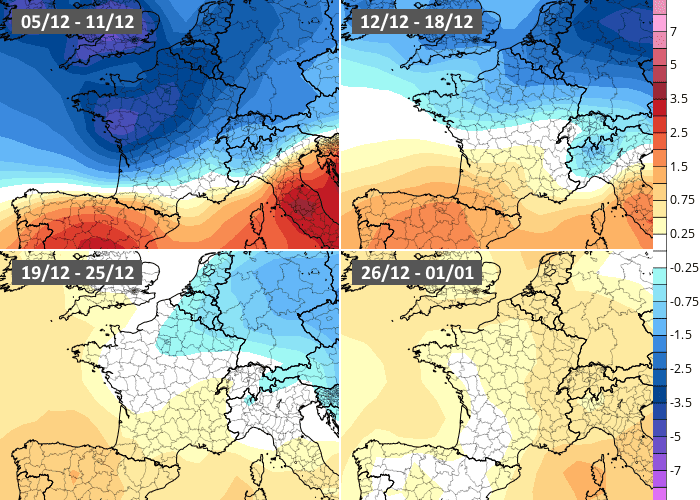 La période la plus froide du mois devrait se dérouler au cours de la fin de cette semaine avec des valeurs hivernales se généralisant. Au cours de la semaine prochaine (du 12 au 18 décembre 2022), le modèle européen envisage un contraste thermique avec un froid persistant au nord mais un redoux au sud. La dernière décade du mois serait ensuite proche des normales, voire un peu plus douces dans le sud de la France. Avec un tel scénario, le mois de décembre 2022 serait plus froid que la normale au nord et plus classique en allant vers le sud.