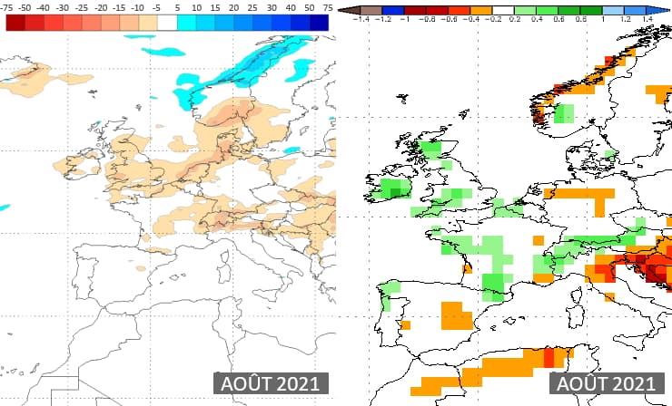 Aucune tendance franche ne se dégage pour le mois d'août 2021 concernant les précipitations. Le modèle européen mise sur de légers déficits tandis que son homologue américain modélise de légers excédents.