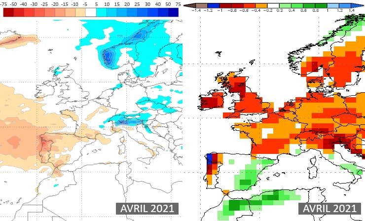 Écart pluviométrique à la normale en avril 2021 par le modèle européen (à gauche) et américain (à droite) - via ECMWF & NOAA