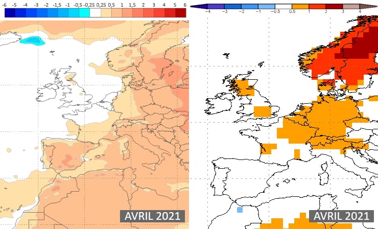 Rappelons que le printemps 2020 avait été plus chaud que la normale en France, malgré des disparités selon les mois. L'excédent de mars fut limité (+0,7°C) et celui de juin minime (+0,2°C). En revanche, on se souvient du mois d'avril 2020 presque chaud avec un excédent de +3°C et de chaleurs précoces en mai (+1,5°C).