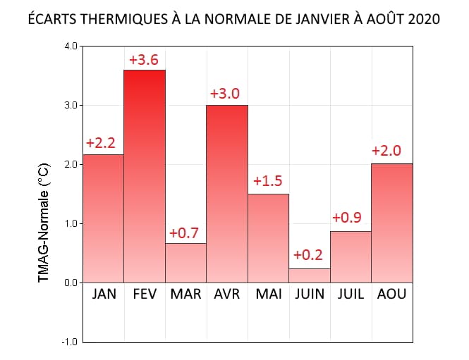 Écarts thermiques à la normale de janvier à août 2020 - via Météo France