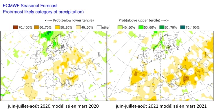 Probabilités d'anomalies pluviométriques sèches/humides pour les étés 2020 et 2021 - via ECMWF