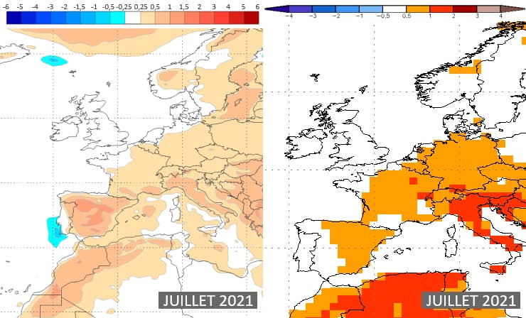 Écart thermique à la normale en juillet 2021 par le modèle européen (à gauche) et américain (à droite) - via ECMWF & NOAA