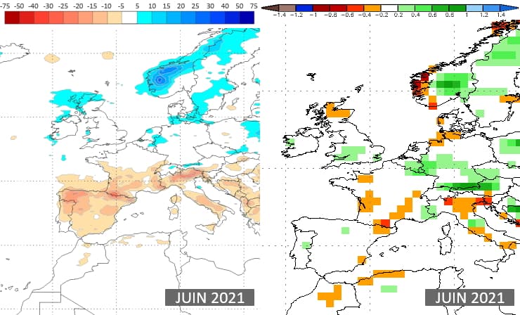 Écart pluviométrique à la normale en juin 2021 par le modèle européen (à gauche) et américain (à droite) - via ECMWF & NOAA