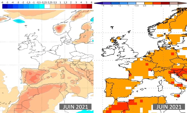 Côté mercure, le scénario retenu par le modèle européen pour juin 2021 montre des températures proches des normales au nord mais plus chaudes au sud. Le modèle américain, quant à lui, propose des valeurs excédentaires jusqu'au nord (sauf vers la Manche). Les deux modèles misent toutefois sur des excédents plutôt raisonnables.