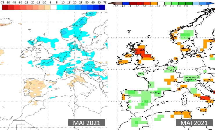 Écart pluviométrique à la normale en mai 2021 par le modèle européen (à gauche) et américain (à droite) - via ECMWF & NOAA