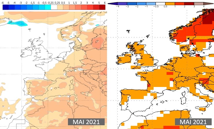 Écart thermique à la normale en mai 2021 par le modèle européen (à gauche) et américain (à droite) - via ECMWF & NOAA