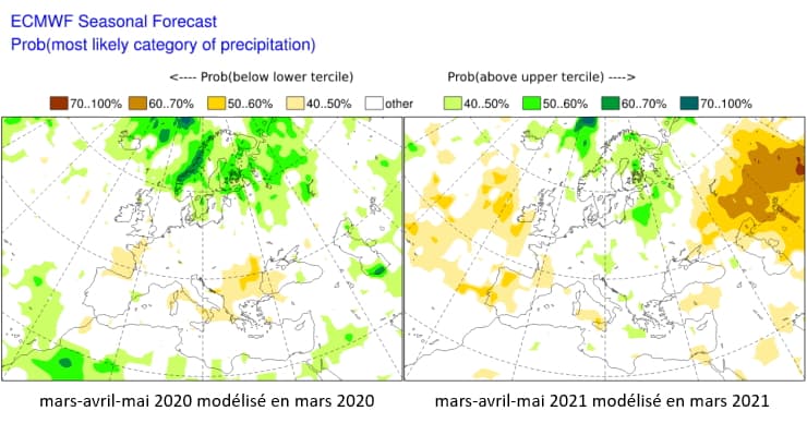 Probabilités d'anomalies pluviométriques sèches/humides pour les printemps 2020 et 2021 - via ECMWF