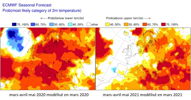 Probabilités d'anomalies thermiques froides/chaudes pour les printemps 2020 et 2021 - via ECMWF