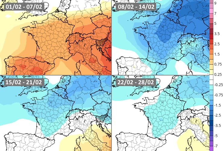 Le modèle américain est en parfait accord pour la première du mois de février qui serait plus douce que la normale en France avec un excédent thermique de +1 à +2°C. En revanche, ce dernier envisage un revirement vers une tendance froide pour la deuxième semaine (du 8 au 14) avec des déficits thermiques proches de -2°C en allant vers le nord-est. La seconde quinzaine de février serait ensuite légèrement plus froide que la normale, sans déficit prononcé.