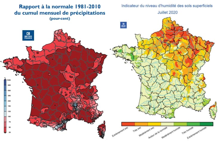 Anomalies de précipitations et sécheresse des sols en juillet 2020 - via Météo France