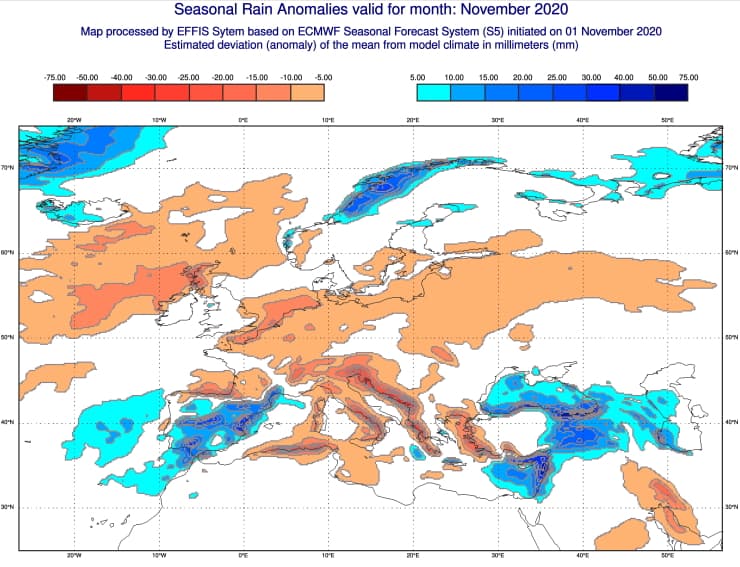 Anomalies pluviométriques européennes en novembre 2020 selon le modèle européen - via EFFIS