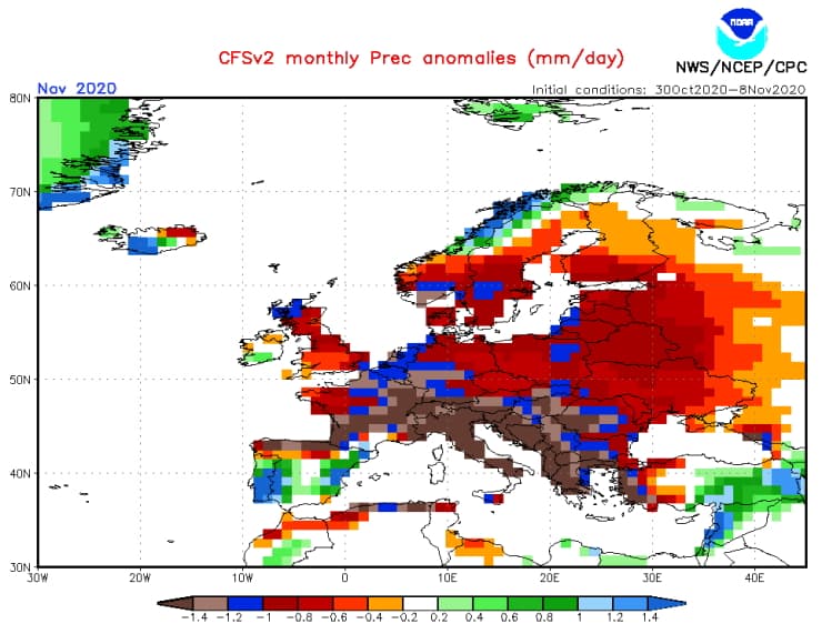 Anomalies pluviométriques européennes en novembre 2020 selon le modèle américain - via NOAA