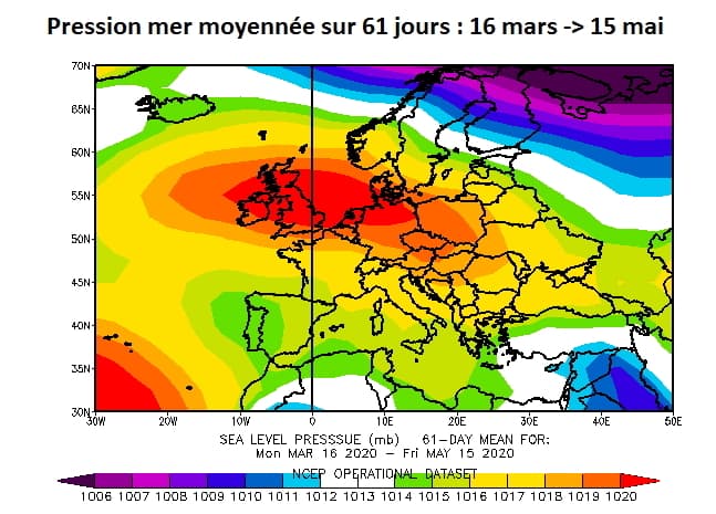 Pressions moyennes sur 61 jours du 16 mars au 15 mai 2020 - via NOAA