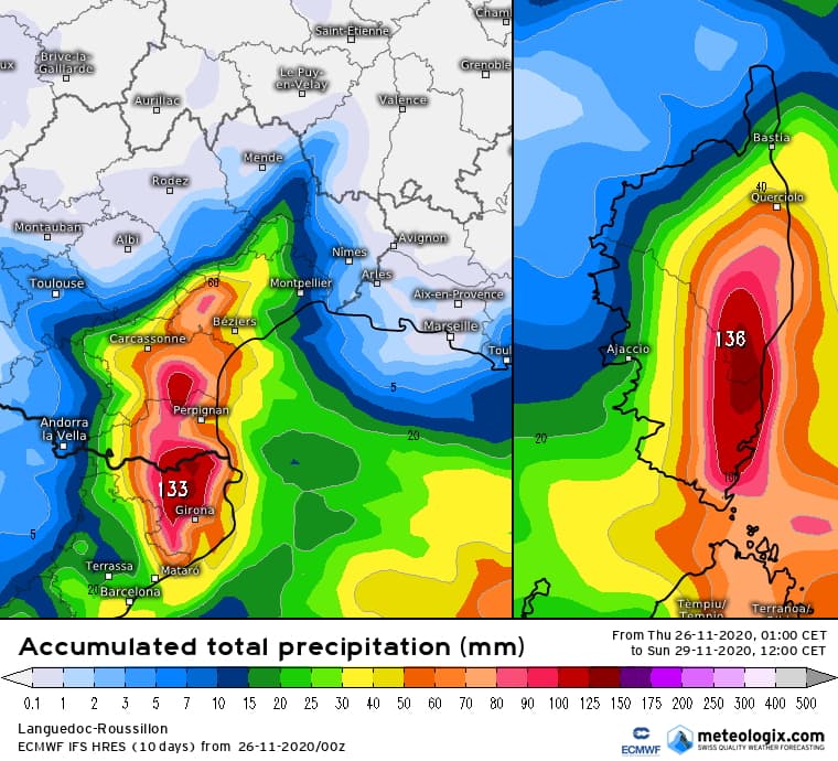 Si les pluies commencent à se mettre en place aux abords du golfe du Lion, elles vont surtout s'intensifier à partir de vendredi soir pour tomber activement tout au long de la journée du samedi 28 novembre 2020 sur les départements de l'Aude et des Pyrénées-Orientales. Elles vont également affecter la Corse où l'accalmie n'interviendra qu'en matinée de dimanche.