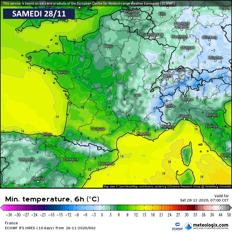 Modélisation des températures minimales du samedi 28 novembre au mercredi 2 décembre 2020 - via meteologix