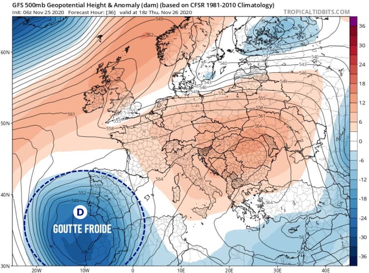 Goutte froide entre le Portugal et le Maroc ce jeudi 26 novembre 2020 - via tropicaltidbits.com