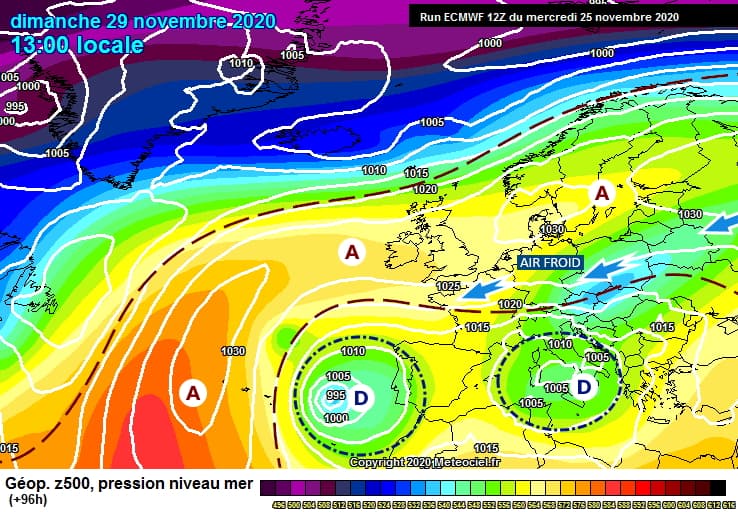 Situation à échelle continentale pour le dimanche 29 novembre 2020 - modèle CEP via meteociel.fr